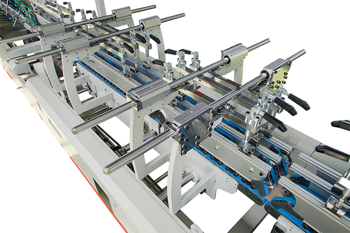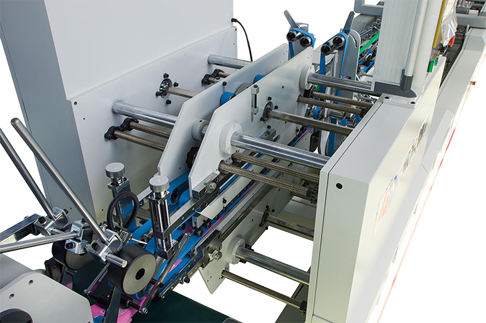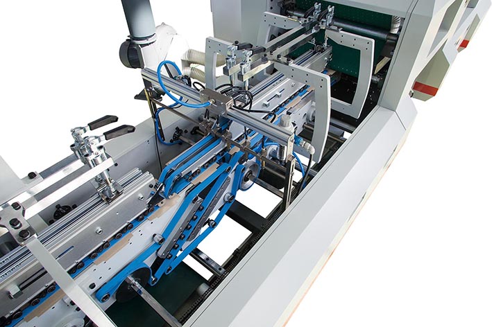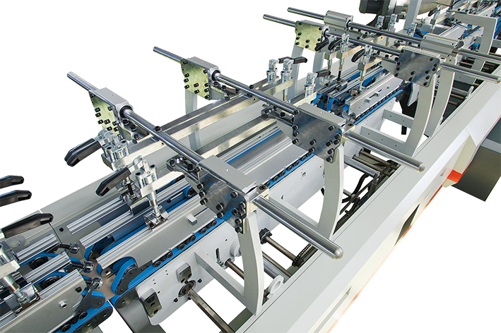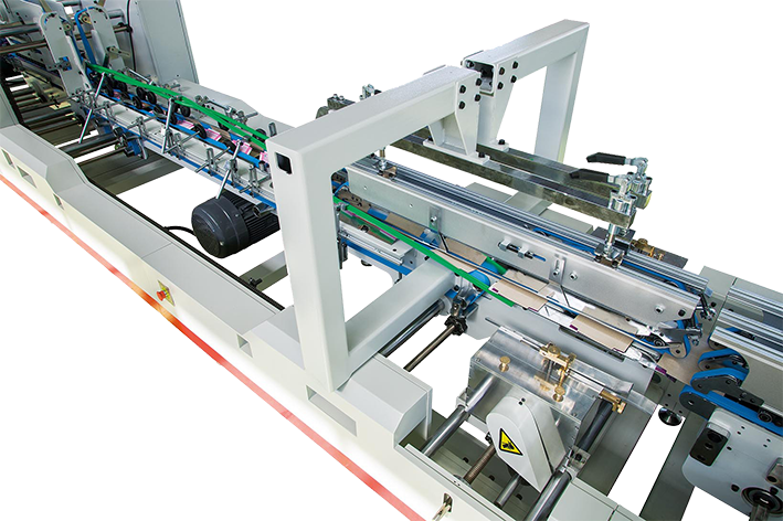 特殊設(shè)計本折部左右輸送折帶速度可單調(diào)節(jié),以校正盒坯行走方向,確保直線輸送。